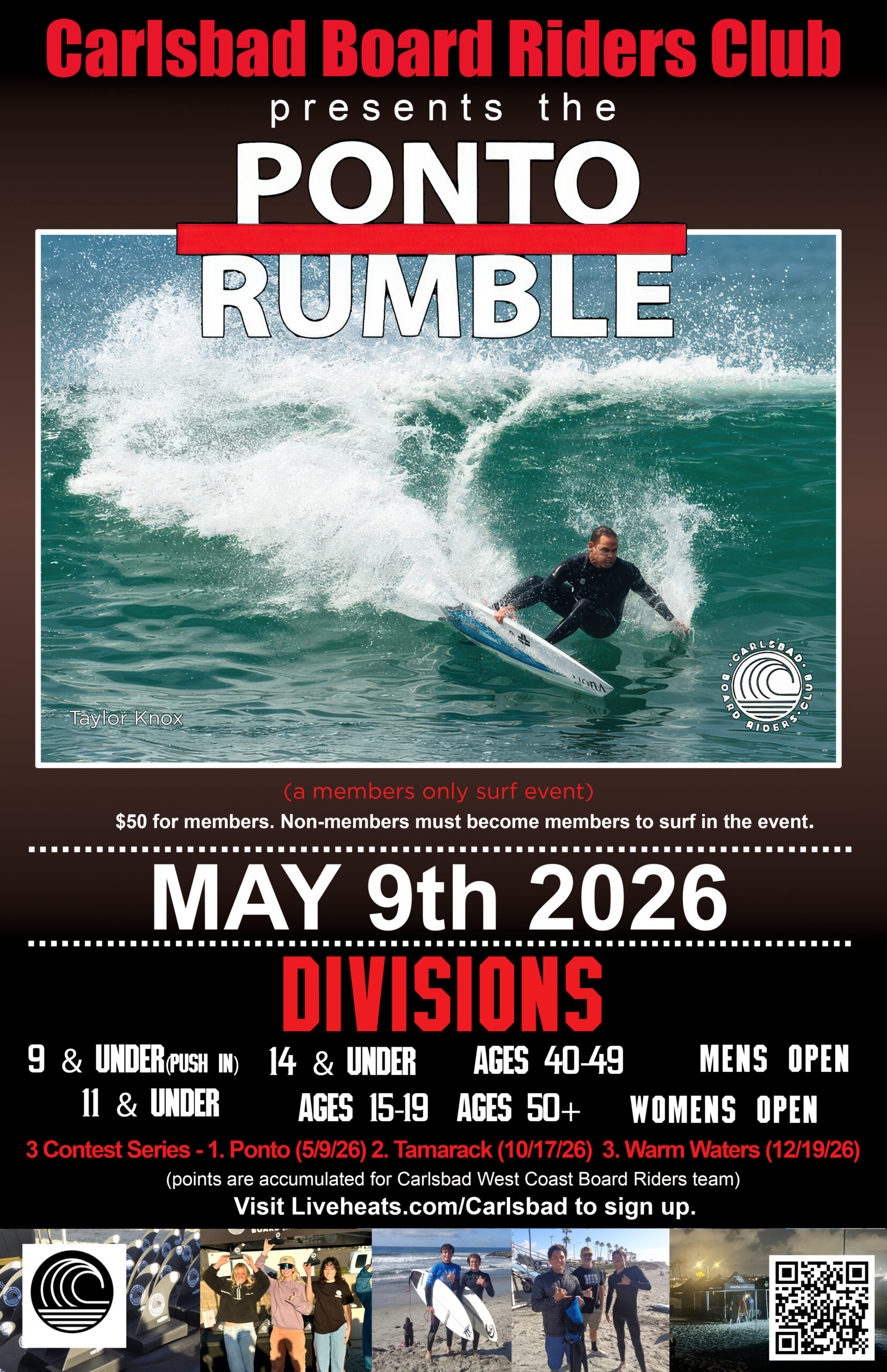 Our first event of the 2026 season. Members only competition at Ponto Beach. Come surf, compete, and represent Carlsbad!